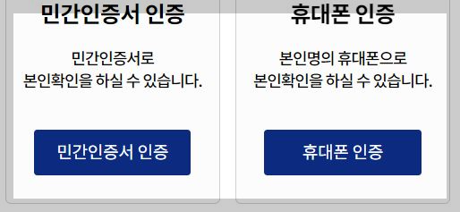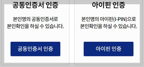7. 본인인증은 민간인증서인증, 휴대폰인증, 공동인증서 인증, 아이핀인증중 한가지를 선택하여 로그인합니다.