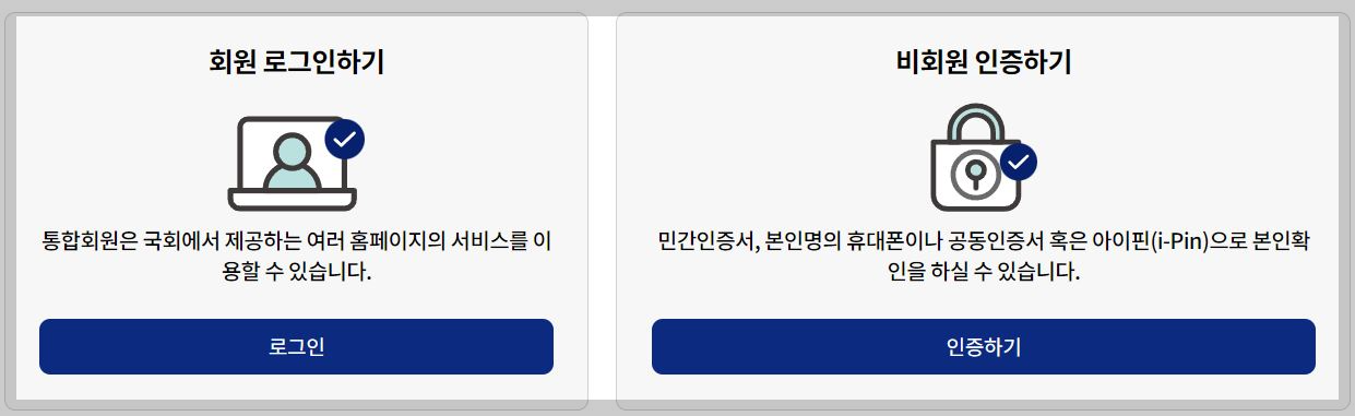 6. 국회전자청원홈페이지 회원일경우에는 회원로그인을 비회원 일경우에는 비회원인증하기를 선택합니다.